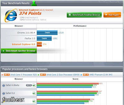 下面是我在office机器上的成绩,从上至下分别是:Chrome 3.0.190.4 - 1519、Firefox 3.5 - 1091和Internet Explorer 8.0 - 374。看来Chrome把其他甩出一大截。