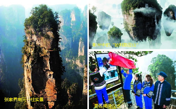 昨日上午,张家界的一个景区袁家界抢先将景区内的“南天一柱”更名为《阿凡达》“哈利路亚山”。“南天一柱”为张家界“三千奇峰”中的一座,位于世界自然遗产武陵源风景名胜区袁家界景区南端,海拔高度1074米,垂直高度约150米,顶部植被郁郁葱葱,峰体造型奇特,垂直节理切割明显,仿若刀劈斧削般巍巍屹立,有顶天立地之势,故又名乾坤柱。张家界方面称,2008年12月份,好莱坞摄影师汉森在张家界进行了4天的外景拍摄,大量风景图后来成为《阿凡达》“潘多拉星球”的元素原型,其中“南天一柱”就是“哈利路亚山”的原型。