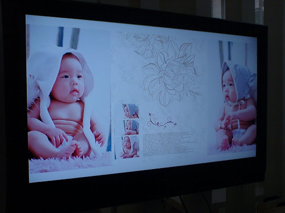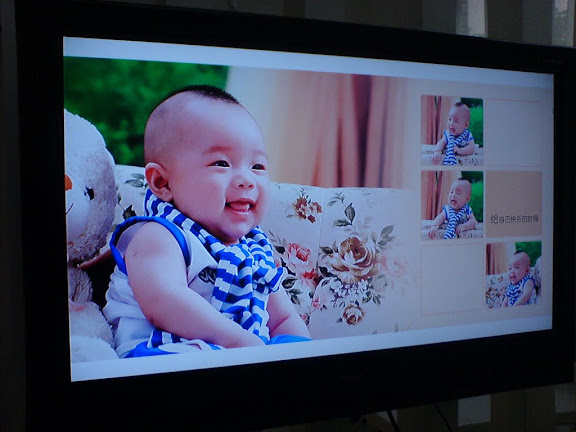 照片拍的真不错,出乎意料。我们选了五张相册版面、一张24寸相框、一张8寸相框,还有六张台历和两张钱包卡片。觉得哪张都好,难以取舍。可惜我忘带 U 盘了,否则当场就 copy 回来了,不必等他们做好册子再刻碟给我们。听他们的意思过年前估计是拿不到了。我只能用手机对着我们的显示器拍了几张,效果都已经不错了。