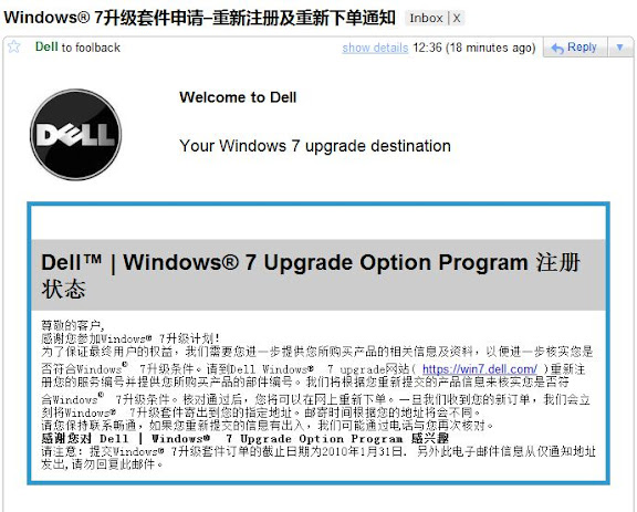 可杯具的是,完成订单,填写发货地址的时候,“国家或地区”里面没有中国。另外注意了,Dell 的 Window 7 升级计划本月底结束,就是不让你在有限的时间里完成订单。F**k!这一招够狠。
