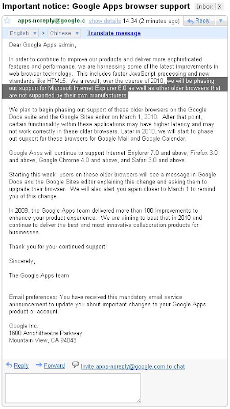 文章标题: 收到 Google Apps 关于停止支持 IE6 的通知