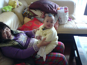 下午宸宸和外婆在沙发上玩耍。