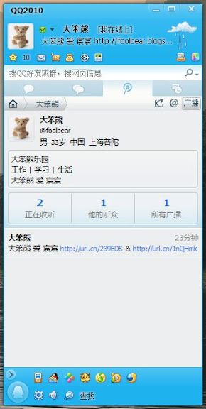 。简单的试用了一下,太简单了,一样是没有从外部同步数据的功能。好处是可以在 最近的 QQ2010 beta 3 客户端上直接查看和更新微博。