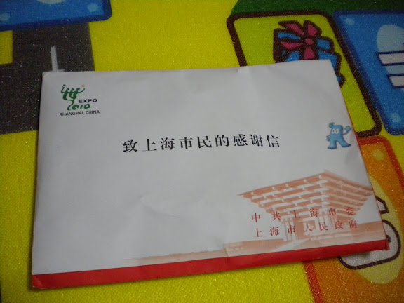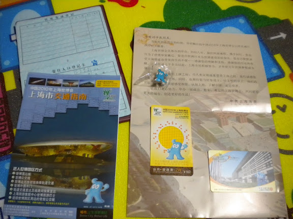 今天回妈妈家,领到了闻名的世博大礼包:户口本被盖上海宝印章,以示已领取;世博上海交通指南;世博七月普通票一张,价值160¥;上海公共交通卡上海世博会纪念卡一张,看不出价值(update@2010.06.17 经验证,已充值200¥),^_^。