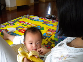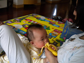 晚上,宸宸外婆给我们做了一顿丰盛的大餐。当然端午少不了传统的粽子和“五黄”。而宸宸只能自己在爬毯上吭苹果,可怜啊。