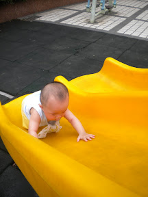 在这里的儿童游乐中心,我们宸宸还滑滑梯。宸宸有些不敢往下滑,手是拽的牢牢的。而且涩涩的,很难滑下来。宸宸倒是很喜欢往上爬,但是脚固定不住,总是上不去。我就跟宸宸一起爬,宸宸抬脚到什么位置,我就用脚撑在那里,让宸宸踩。就这样宸宸能很顺利爬到顶端,速度还挺快。可惜只有我一人,否则应该拍一段视频的。