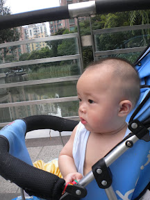 今天天气还不错,多云,稍热,微风,适合出门。先是到雅苑一期、二期转转,在一景观处带宸宸玩,练习走路,吃吃磨牙饼干,喝喝水。还在小水池边玩水,弄得背心都湿了,只好用绢头点在背心里面。