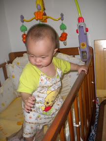 目前小床的栏杆只是到宸宸的胸部,稍微往上爬,就有可能翻过来的。