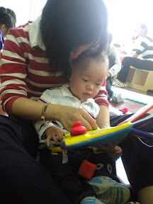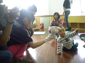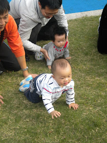 今天上课是在山坡的草地上玩耍,爬行、抓球,我们宸宸已经一岁了,当仁不让,是表现的最好的。小朋友在一起,宸宸老开心的。还教宸宸看书书、听玩偶故事。听故事的时候,所有的孩子都被吸引了,一个个爬到老师面前去玩了。三个新来的实习老师就喜欢和宸宸玩,因为我们宸宸可爱啊。