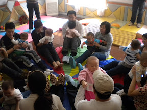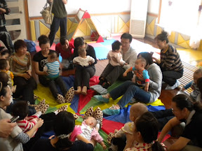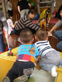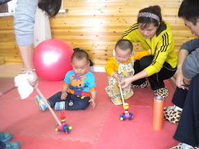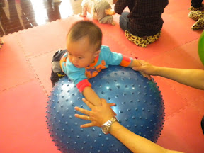补充好营养后,我们继续室内活动。各种玩具,我们还第一次在大健身球上玩,还有集体活动。