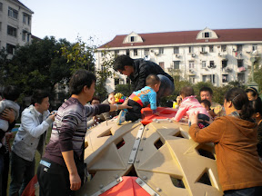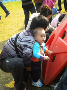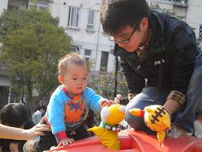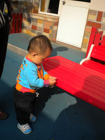 室外活动是玩攀爬穹顶,宸宸爬是爬不上的,不过把他托到穹顶上,玩小洞洞里“钻出来”的手指布偶,比谁都开心。我们还钻到穹顶下面,让宸宸从里面往外看。