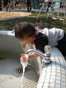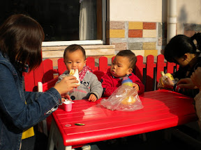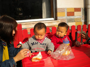 宸宸和嘟嘟哥哥一边晒太阳一边喝水、吃东西。